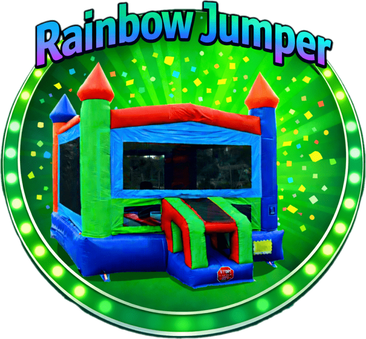 - This Heavy-Duty Commercial rainbow castle jumper is great for birthday parties, church events, recreation centers and more. The Colorful theme is always a popular rental and is appealing to both boys and girls of all ages. Renter will provide power source within 100ft. Delivery, setup, and take down are included in price*. Bounce Houses require one supervisor at all times.